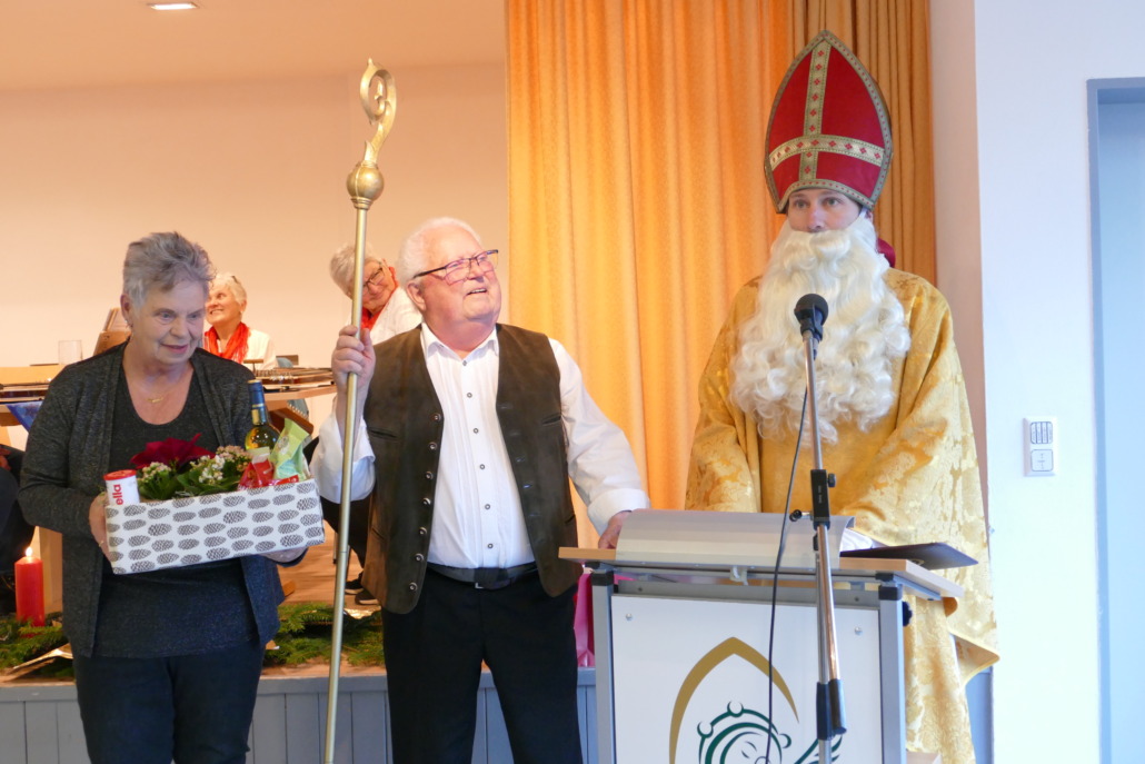 Auf dieser Adventsfeier auf die sich alle schon immer sehr freuen gab es dieses Mal einen Überraschungsgast, von dem Hermann Mayr wirklich keine Ahnung hatte: Es war der Heilige Nikolaus. Der zollte dem Vorsitzenden offiziell großen Dank für sein außerordentliches Engagement für den Seniorenclub, den er seit nunmehr 25 Jahren betreut. Eingebettet in das bekannte Gedicht von Theodor Storm – „Von drauß vom Walde komm ich her“ – reimte er in schönstem Dialekt ein Lob auf die vielfältigen Unternehmungen des Seniorenclub-Leiters. So meinte er: „In Hoimakirch isch heit was los, es gaut um dr Herrmann und zwar ganz groß, — Ob rede, singe oder ebbes bringe zum Schnabuliera, dafür woll mer deam Herrmann recht schia gratuliera.“ Für all seine Arbeit überreichte er ihm mit vielem Dank eine kleine Geschenkkiste. Kaum war der Nikolaus gegangen, kam Pfarrer Wißmiller, den Hermann Mayr zu Beginn der Feier sehr vermisst hatte.