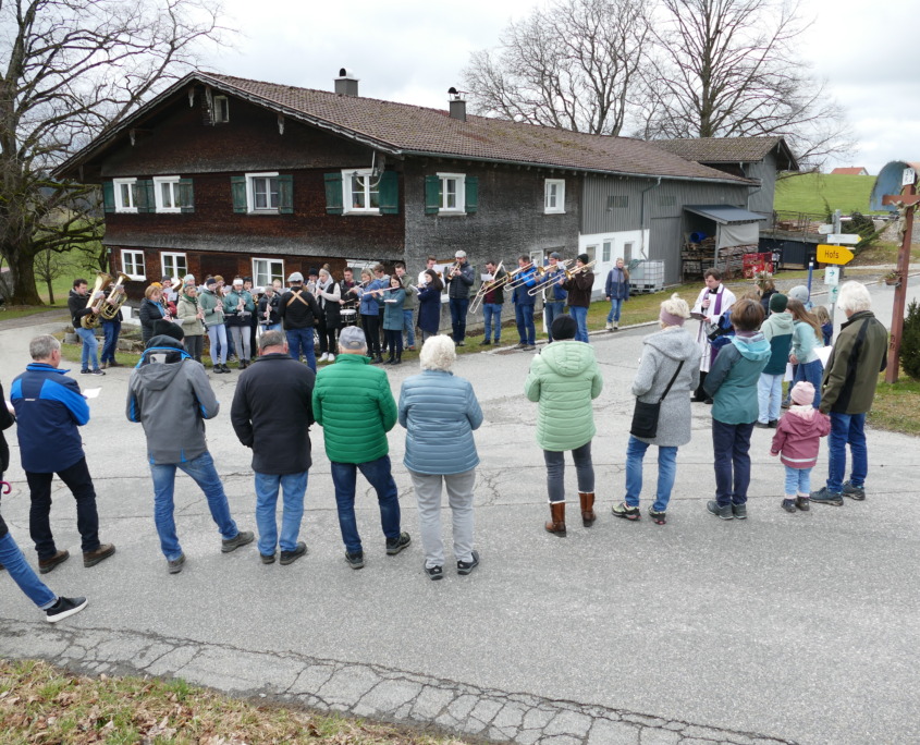 Jedes Jahr wird ein anderes Thema gewählt. Um Gesundheit, Liebe und Zufriedenheit ging es dieses Mal. Kamen anfangs nur wenige, die sich diesem Bittgang anschlossen, so waren in diesem Jahr etwa 100 Personen unterwegs. Begleitet wurden sie auf ihrem Weg mit insgesamt vier Stationen von einer großen Abordnung der Musikkapelle Heimenkirch. Unter Leitung von Simon Ess spielten sie Lieder, die ins Ohr und ins Herz gehen, wie „Immer auf Gott zu vertrauen“. Von Lektorinnen wurden zu den diesjährigen drei Themen jeweils Erzählungen vorgelesen. Es waren kurze Geschichten die berühren, verzaubern, inspirieren und motivieren. Pfarrer Helmut Wißmiller griff diese Themen auf und übertrug sie versiert in das heutige Leben.